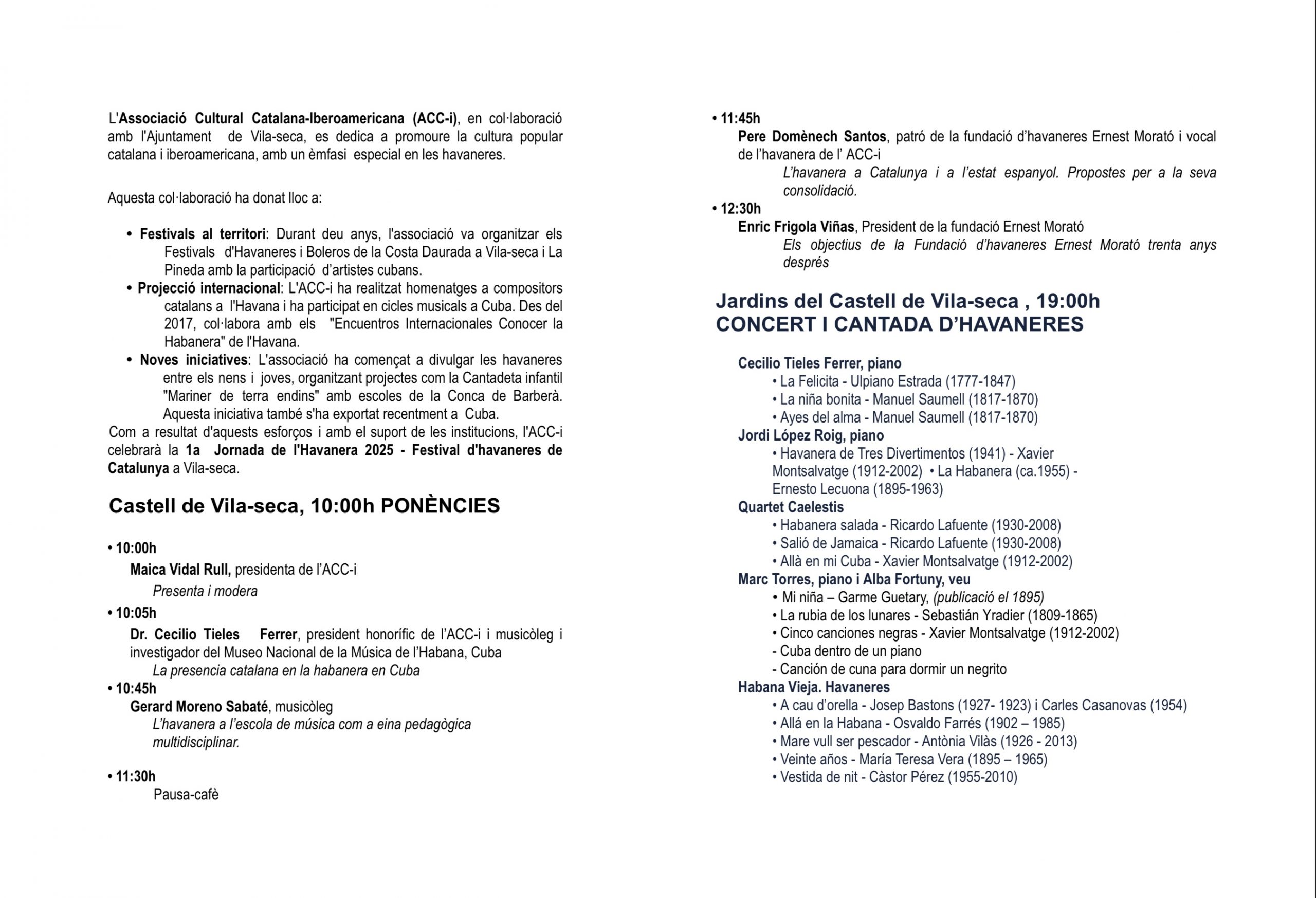 El diumenge 28 de setembre de 2025 tindrà lloc al Castell de Vila-seca la 1a Jornada de l’havanera. Un dia ple d’activitats al voltant del mon de l’havanera amb 4 ponències molt interessants al matí i concerts amb presència de diferents solistes i agrupacions per la tarda. No hi falteu, us hi esperem!!